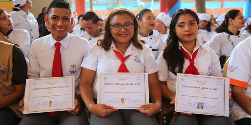 139 jóvenes protagonistas del Tecnológico Nacional de Hotelería y Turismo del INATEC, recibieron certificados como egresados de las especialidades en: Técnico General en Atención al Cliente y Recepción, Dirección de Alimentos y Bebidas, Guía de Turista Nacional, Cocina y Gastronomía, Pastelería y Panadería; Servicio de Restaurante Bar y Cafetería.